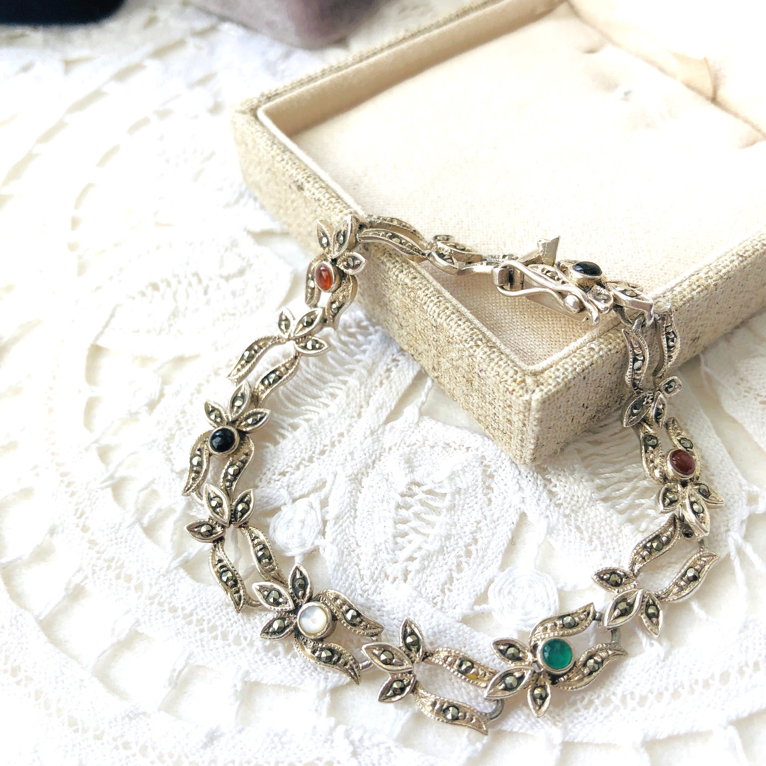 マーカサイトに装飾された植物モチーフに、小さな天然石4種を使ったシルバーブレスレット。カラフルな中にも落ち着いた雰囲気を残すデザインです。