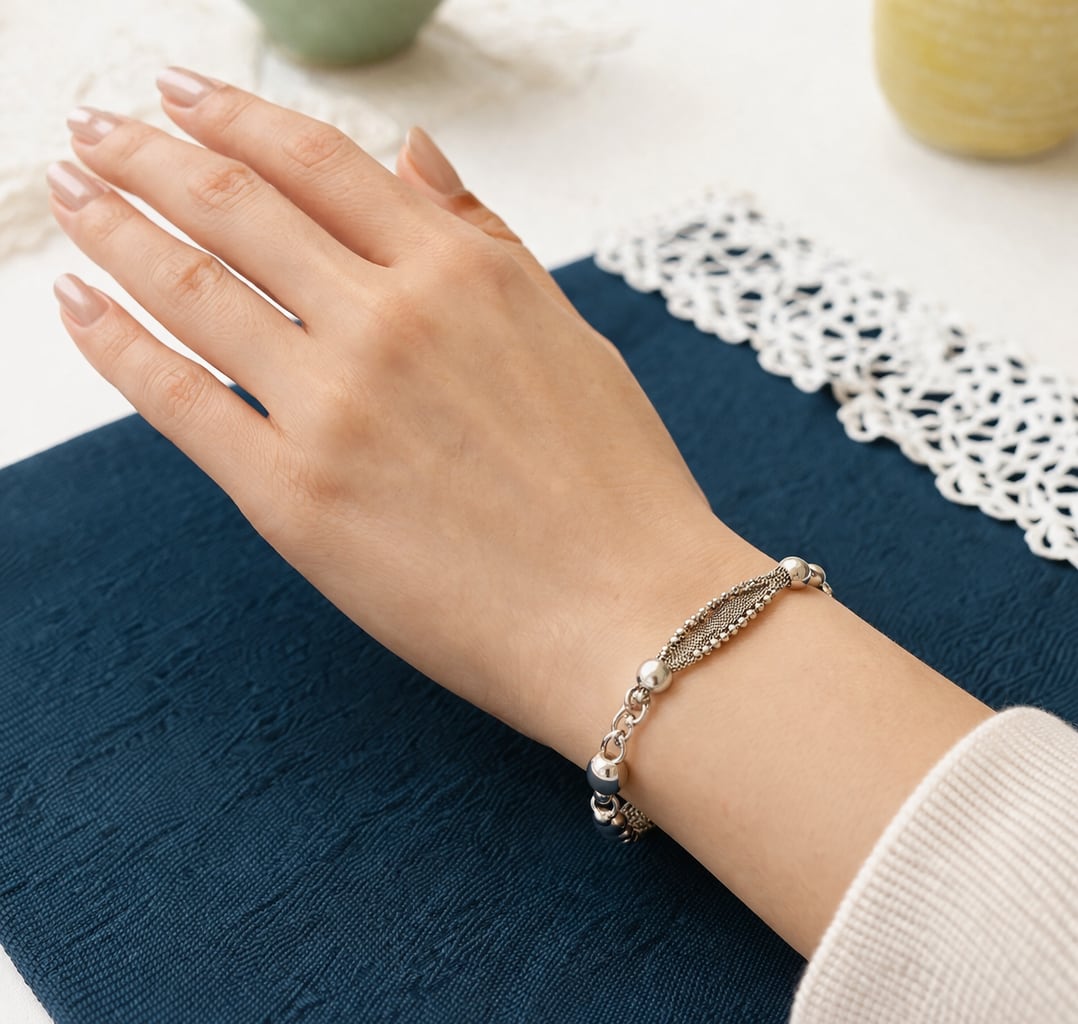数種類の細いシルバーチェーンが組み合わされたブレスレット。