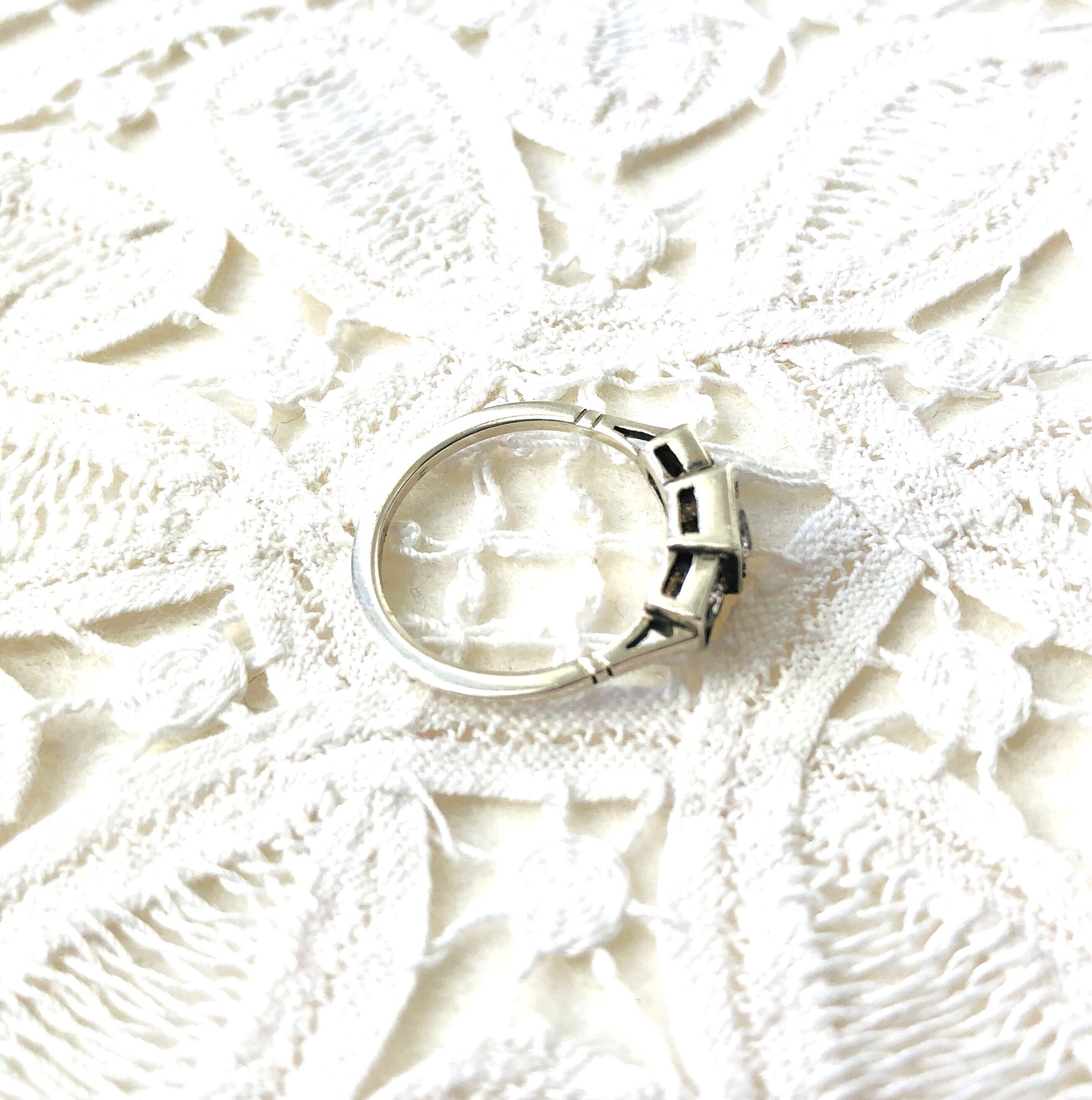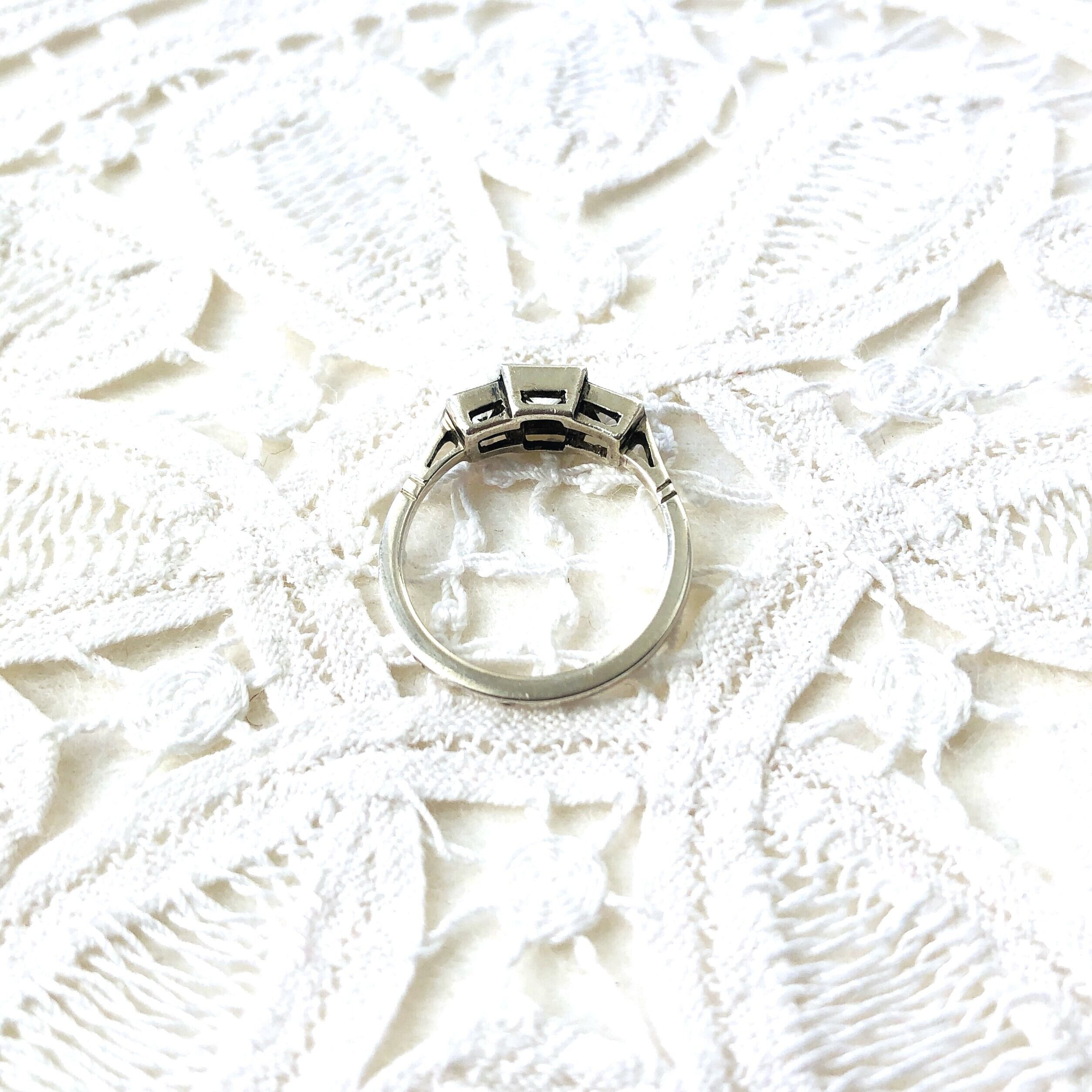 直線的ですっきりと凛々しいデザインの、アールデコ調ヴィンテージリング。透明なスピネルが3つ配されています。アールヌーヴォーが女性的ならアールデコは男性的、と言われるように、パンツスーツにも似合うデザインのリングです。