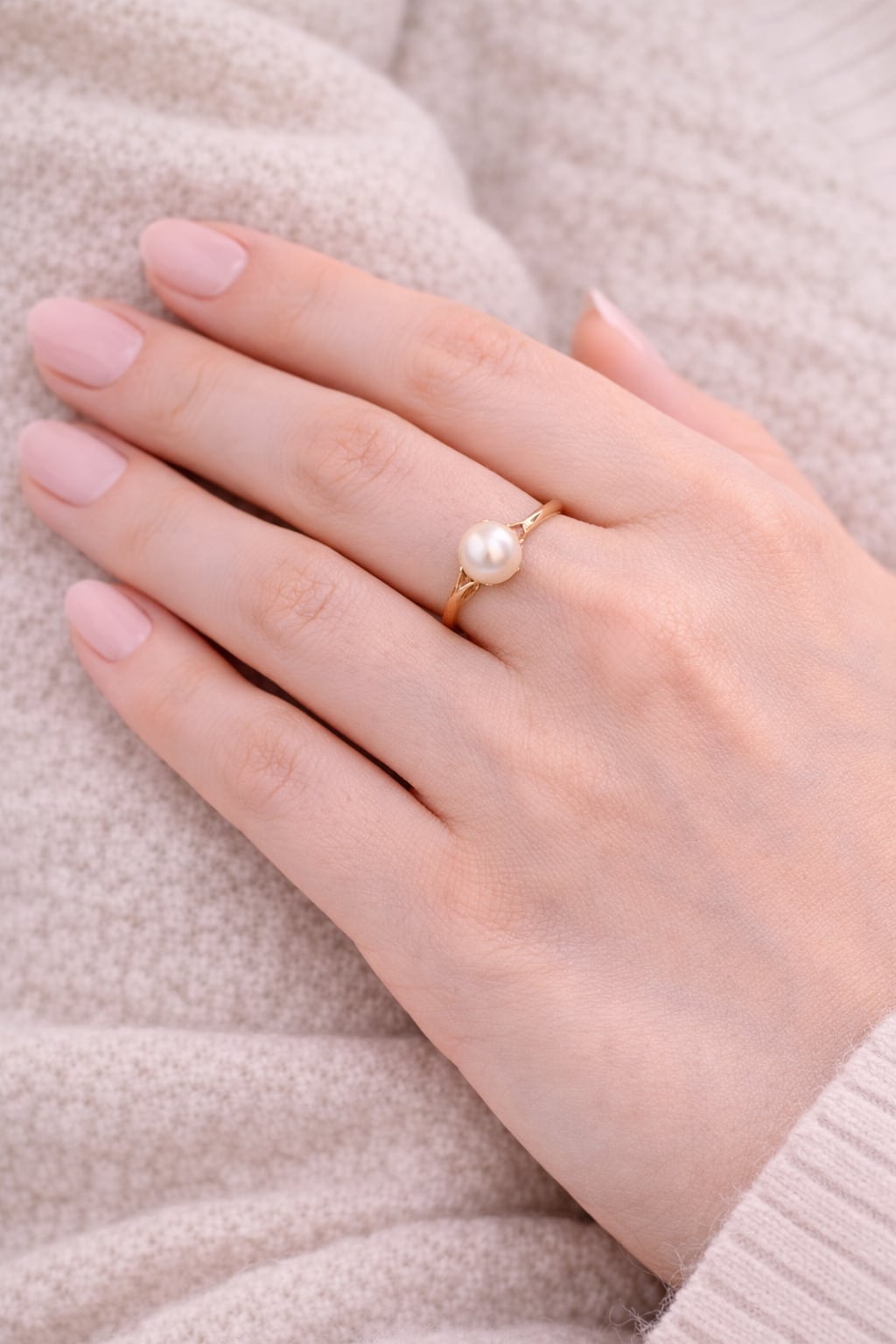 ごく薄くピンクがかったようにも見える、つやのある輝きのパールのソリテール。土台のゴールドリングの優しい色味とともに、大人かわいい、やわらかな印象をお手元に与えます。